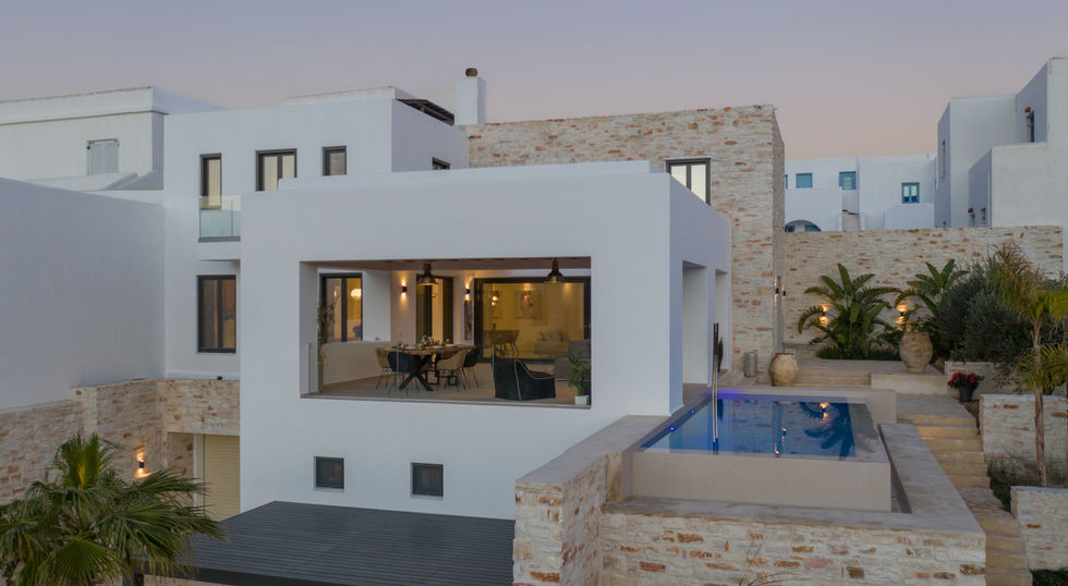 A modern four-bedroom villa with a separate guest house, perched on a hill overlooking Piso Livadi beach and port. Just 18 minutes from Naoussa, this spacious retreat is ideal for large groups seeking a luxurious Cycladic island experience.