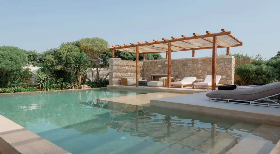 Private pool, loungers [10], sitting area under pergola, BBQ.